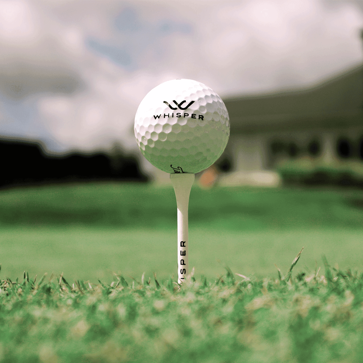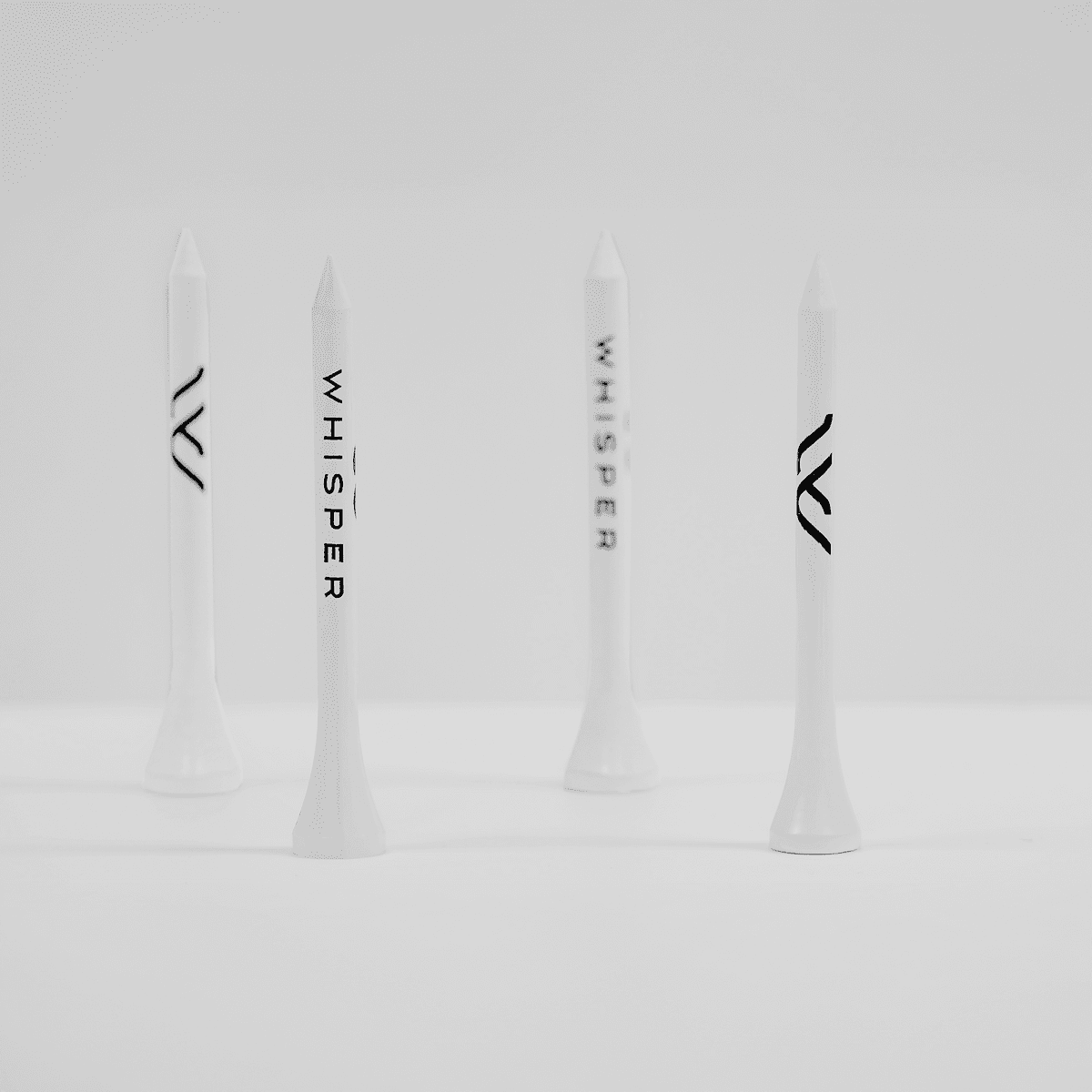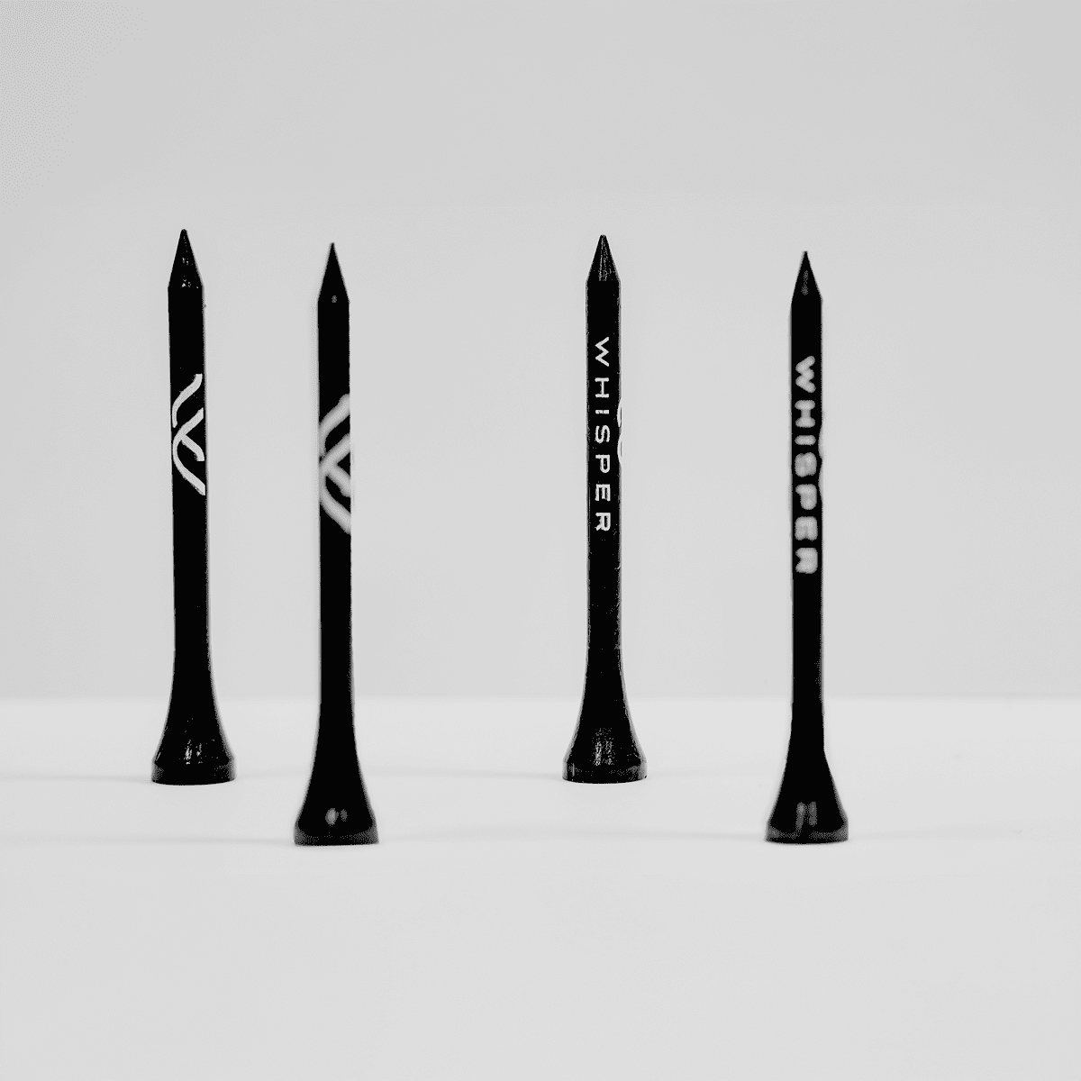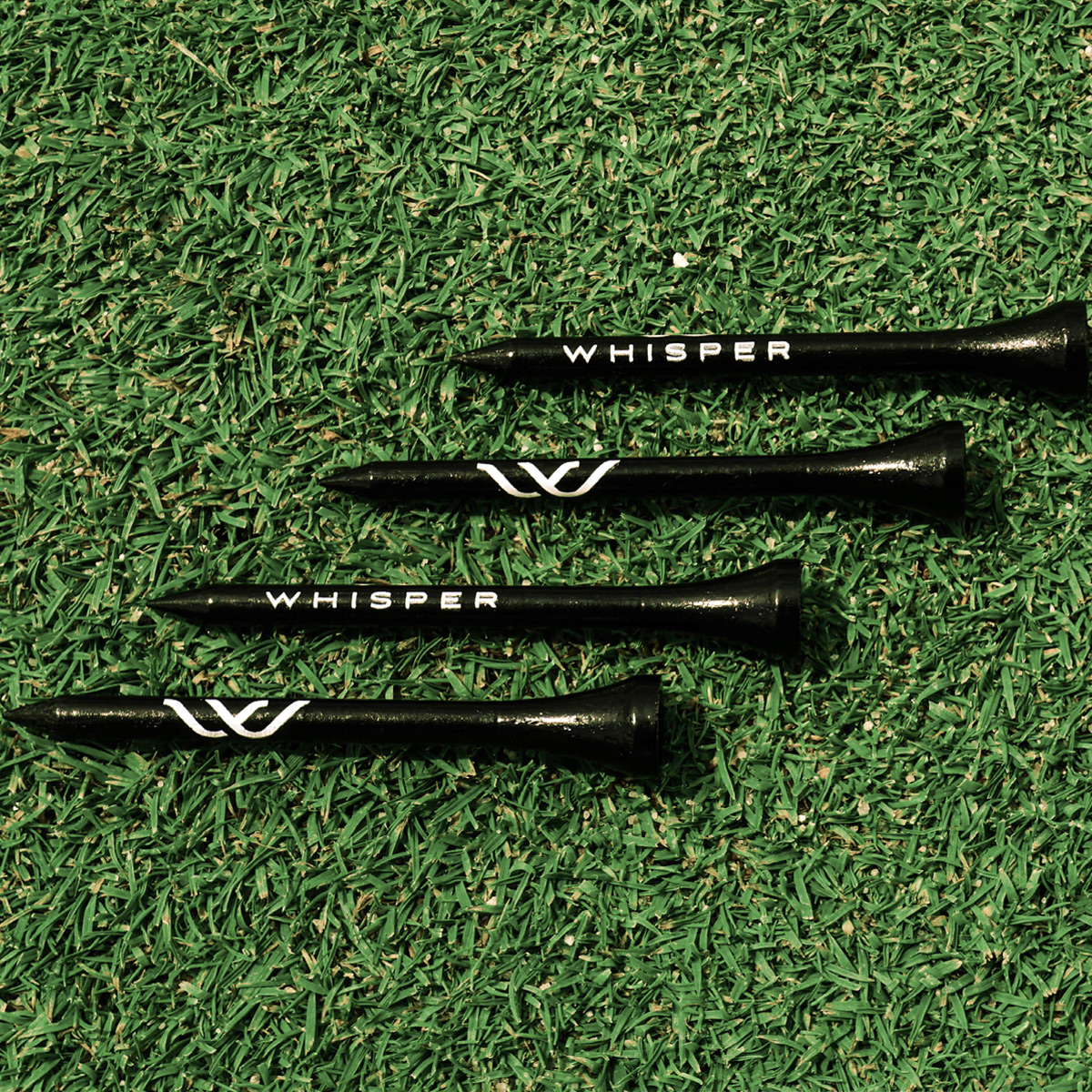 Whisper-branded, eco-friendly bamboo golf tees are available in both black and white colors. Each set includes four tees and a ball marker